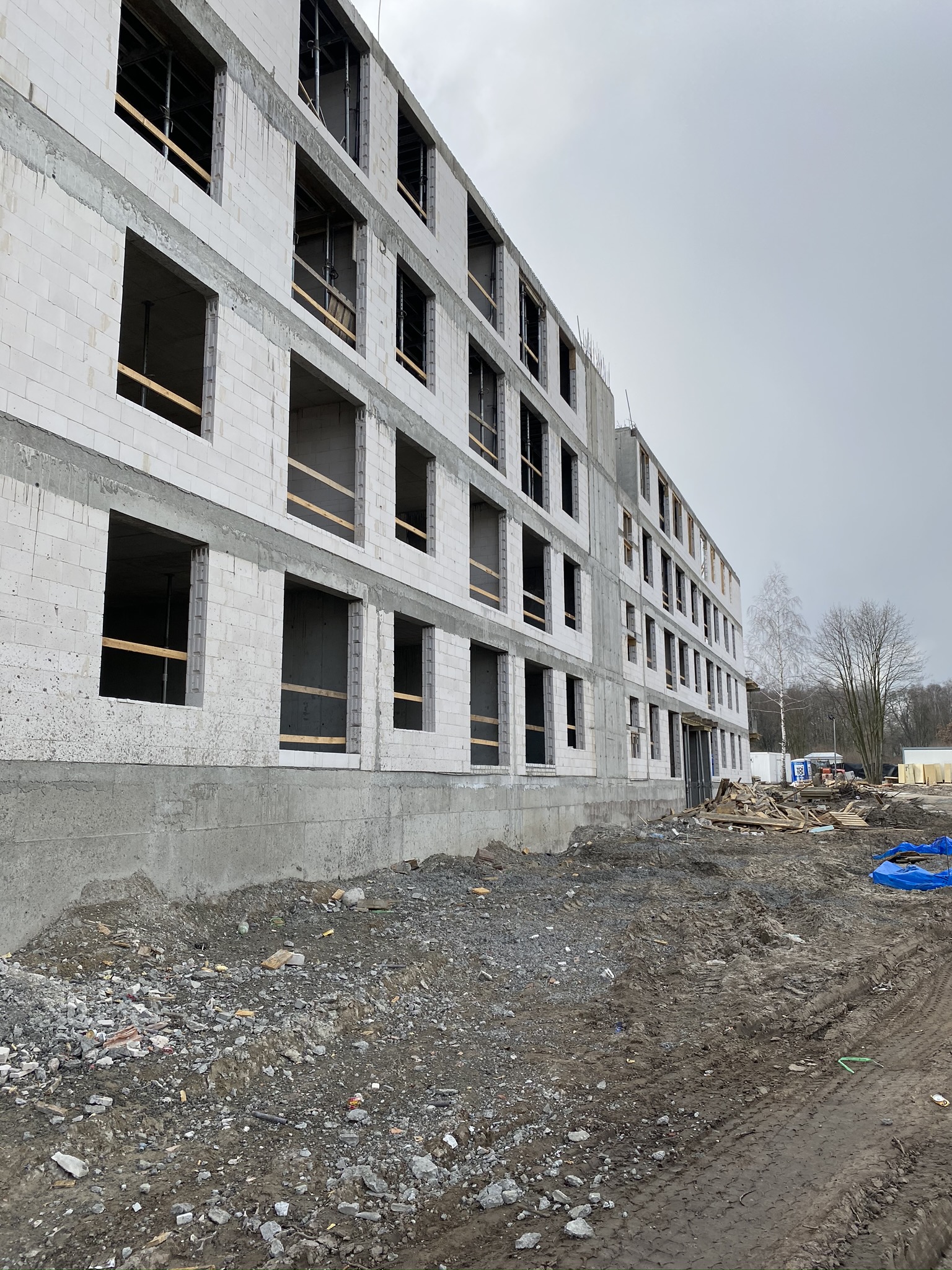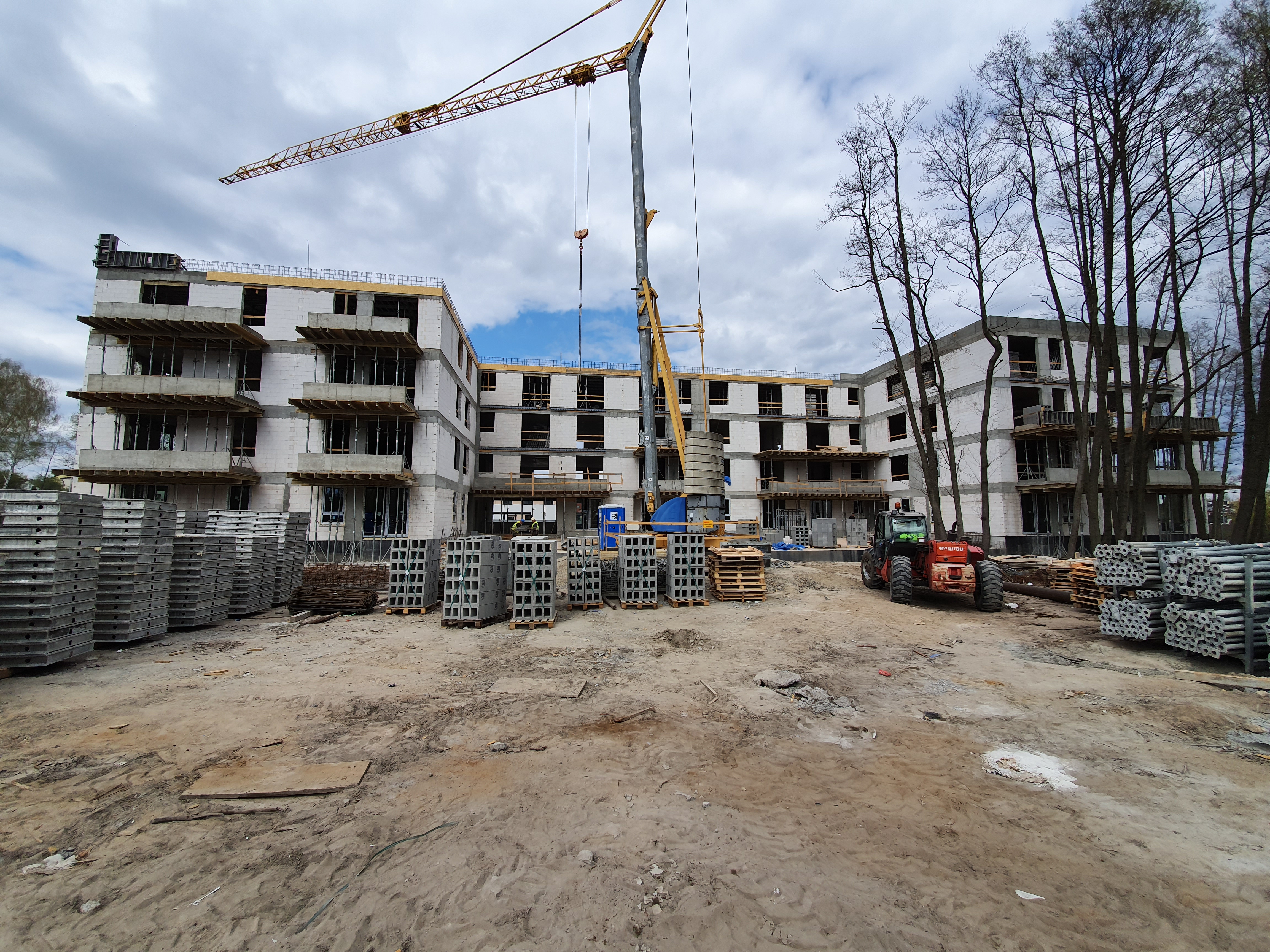 Aktualnie wszystkie prace budowlane postępują zgodnie z założonym harmonogramem. Zbliżamy się do końca prac żelbetowych konstrukcji budynków. Trwają również prace murarskie w zakresie ścian zewnętrznych oraz ścian wewnętrznych.