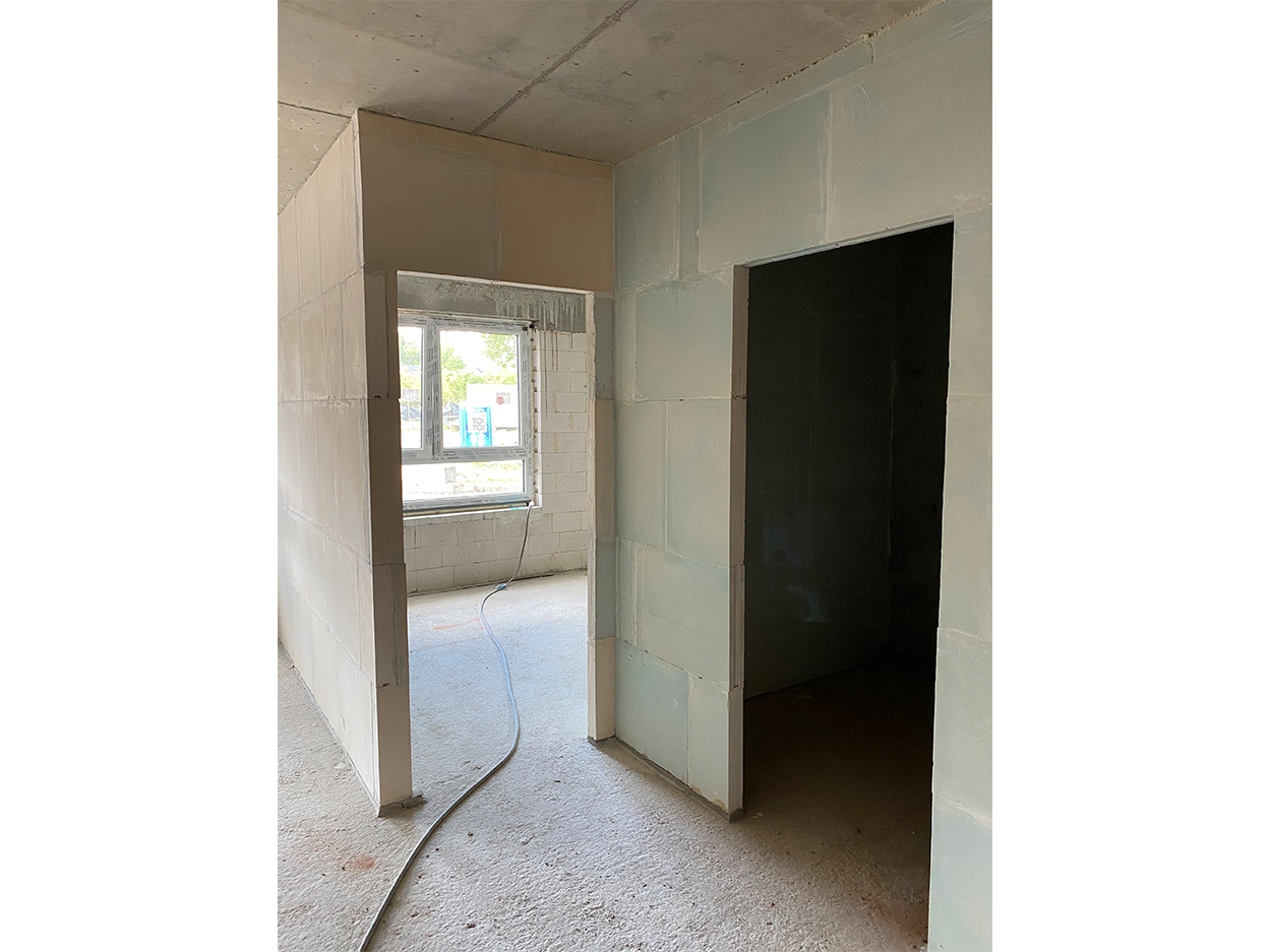 - Prowadzone są roboty murowe wewnętrzne przy ściankach działowych lokali mieszkalnych na ostatniej kondygnacji