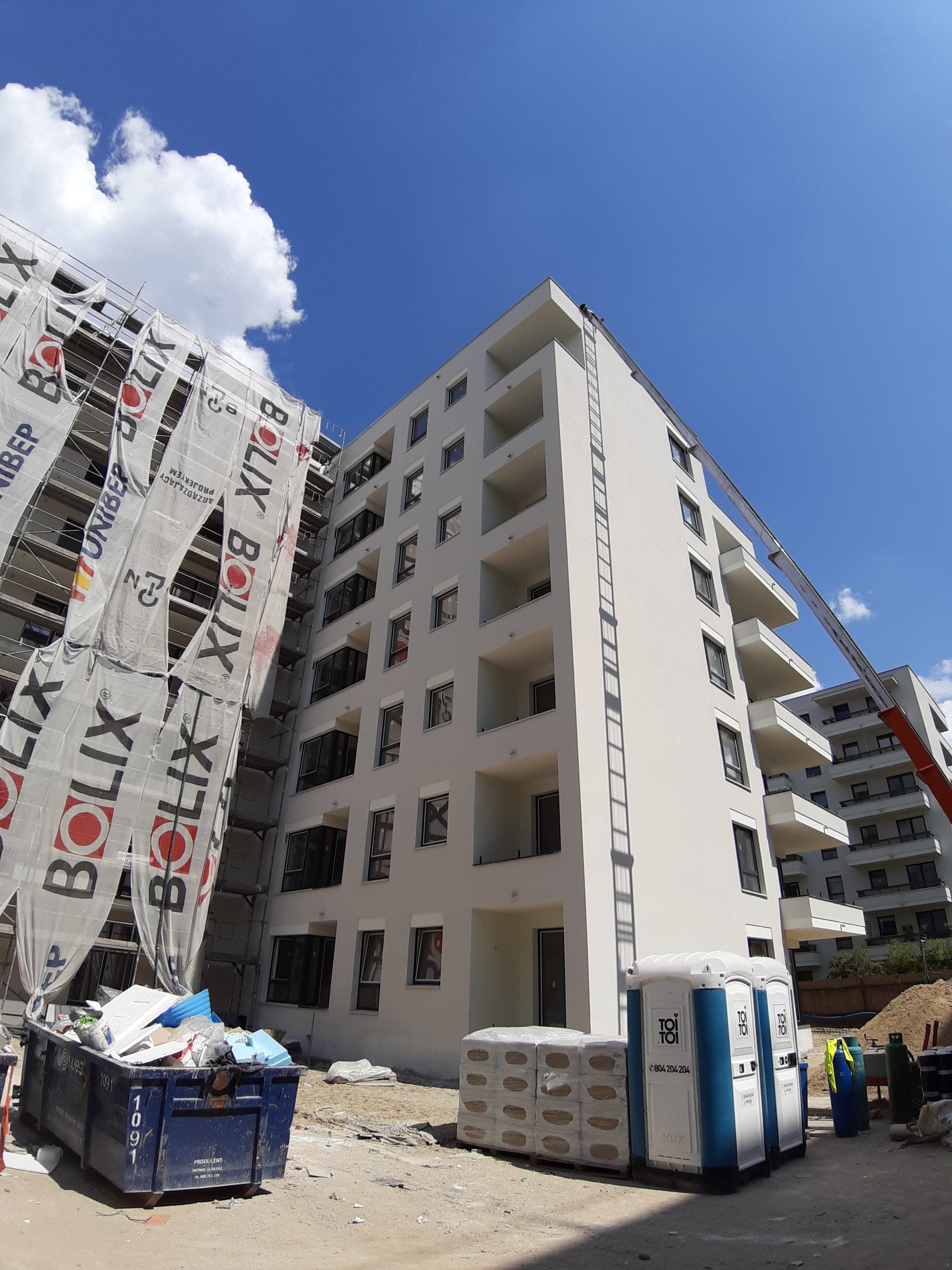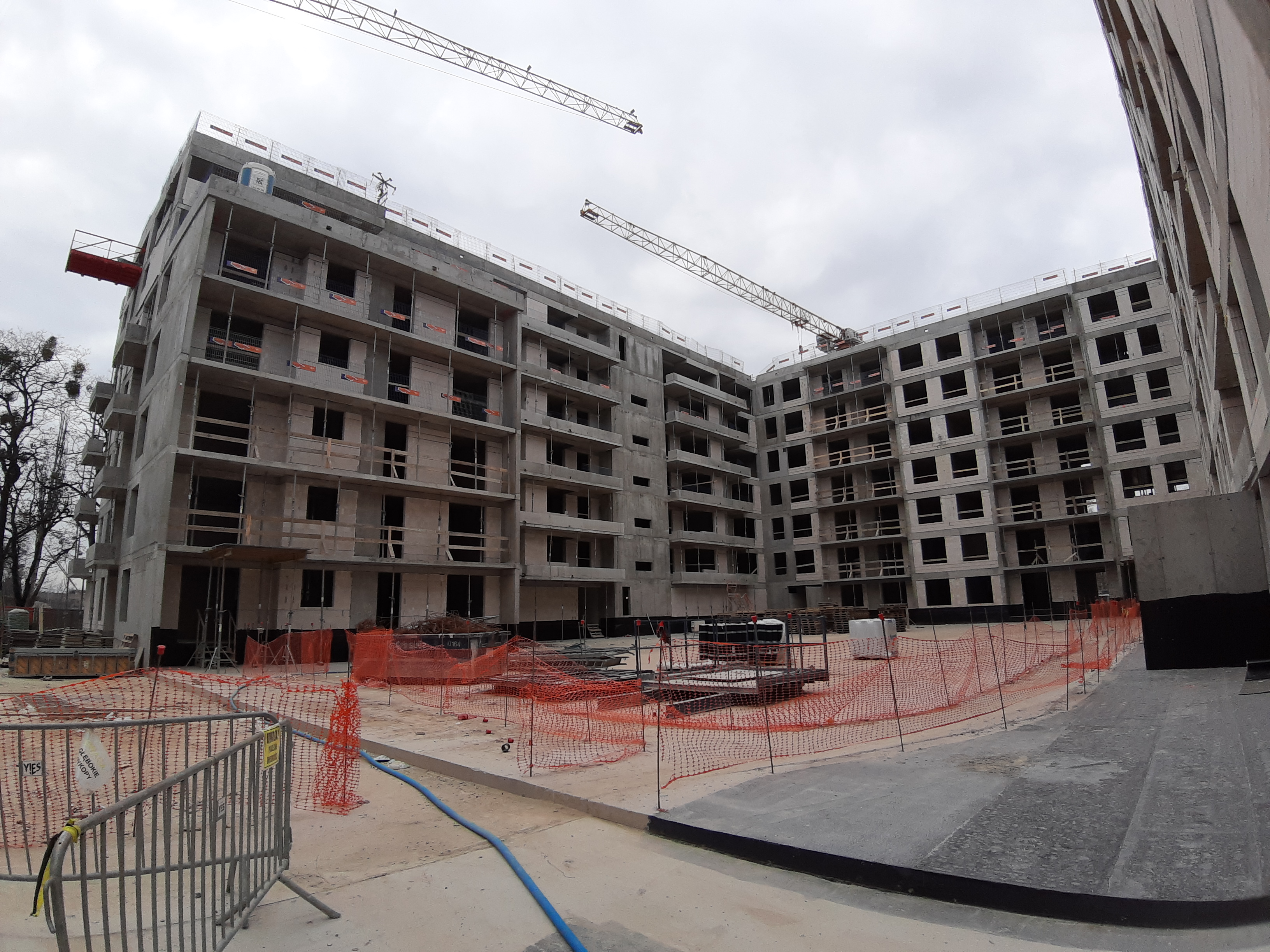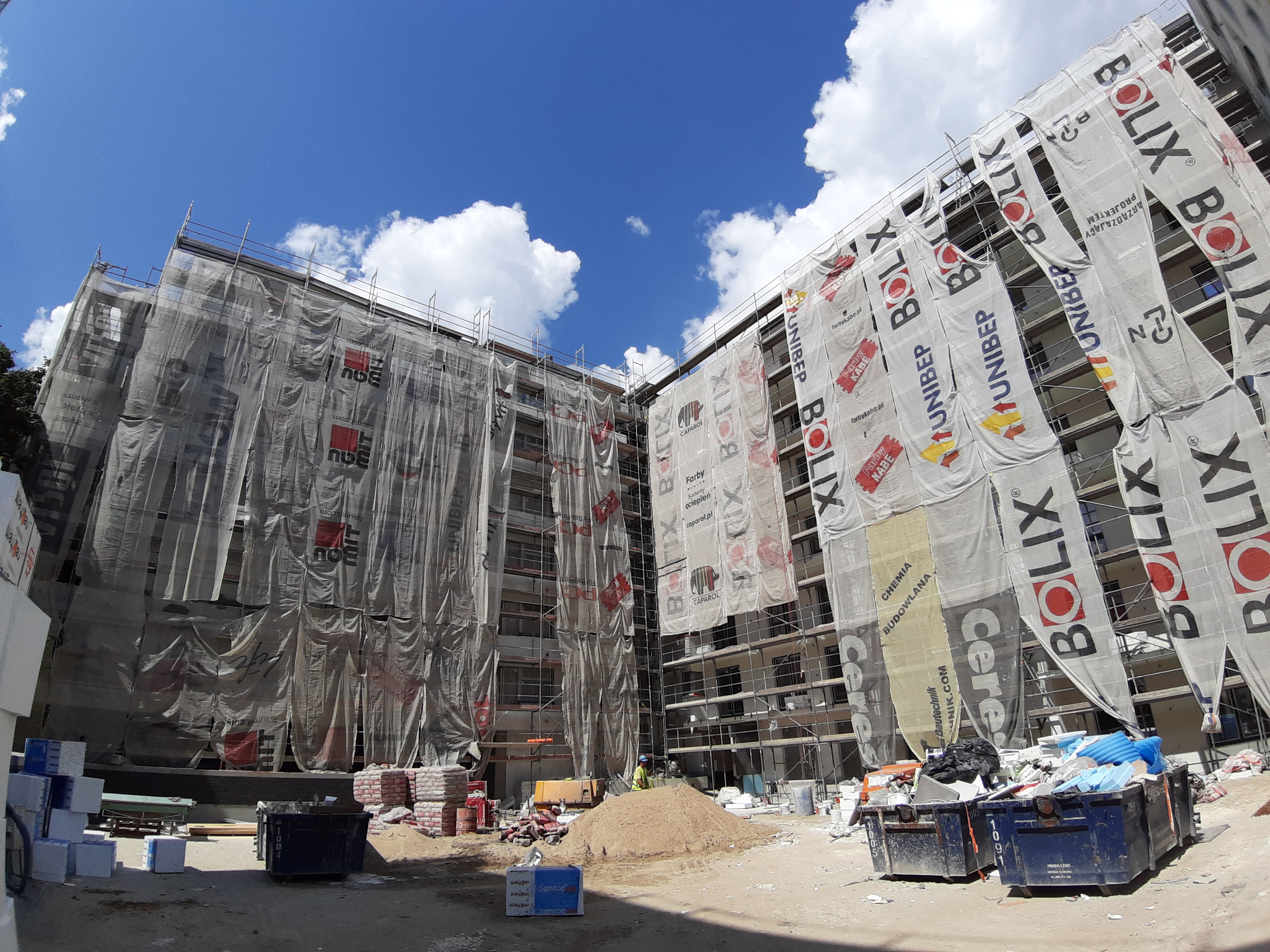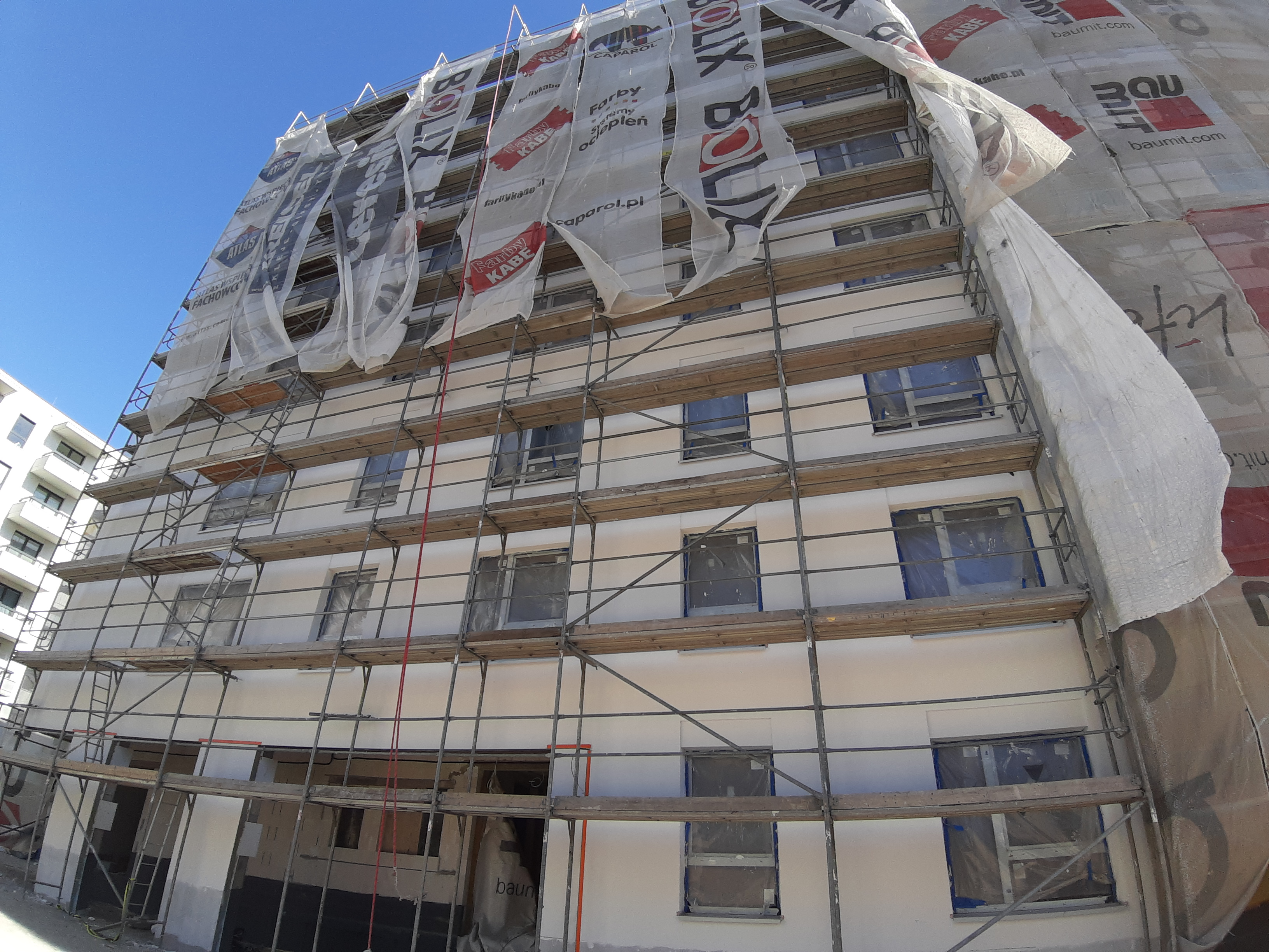 - Część budynku E jest już w rusztowaniach, wykonywane jest również docieplenie budynku.
