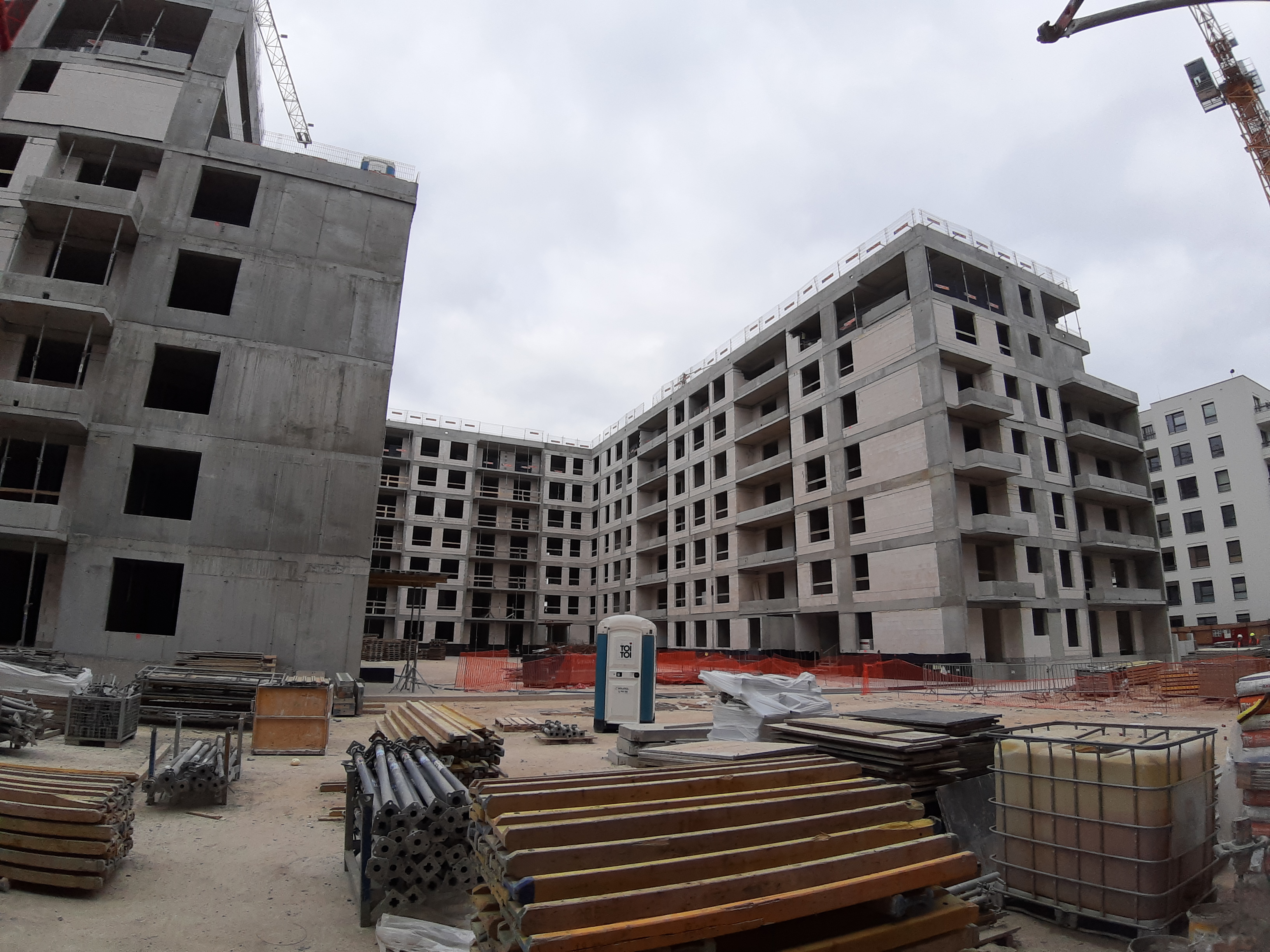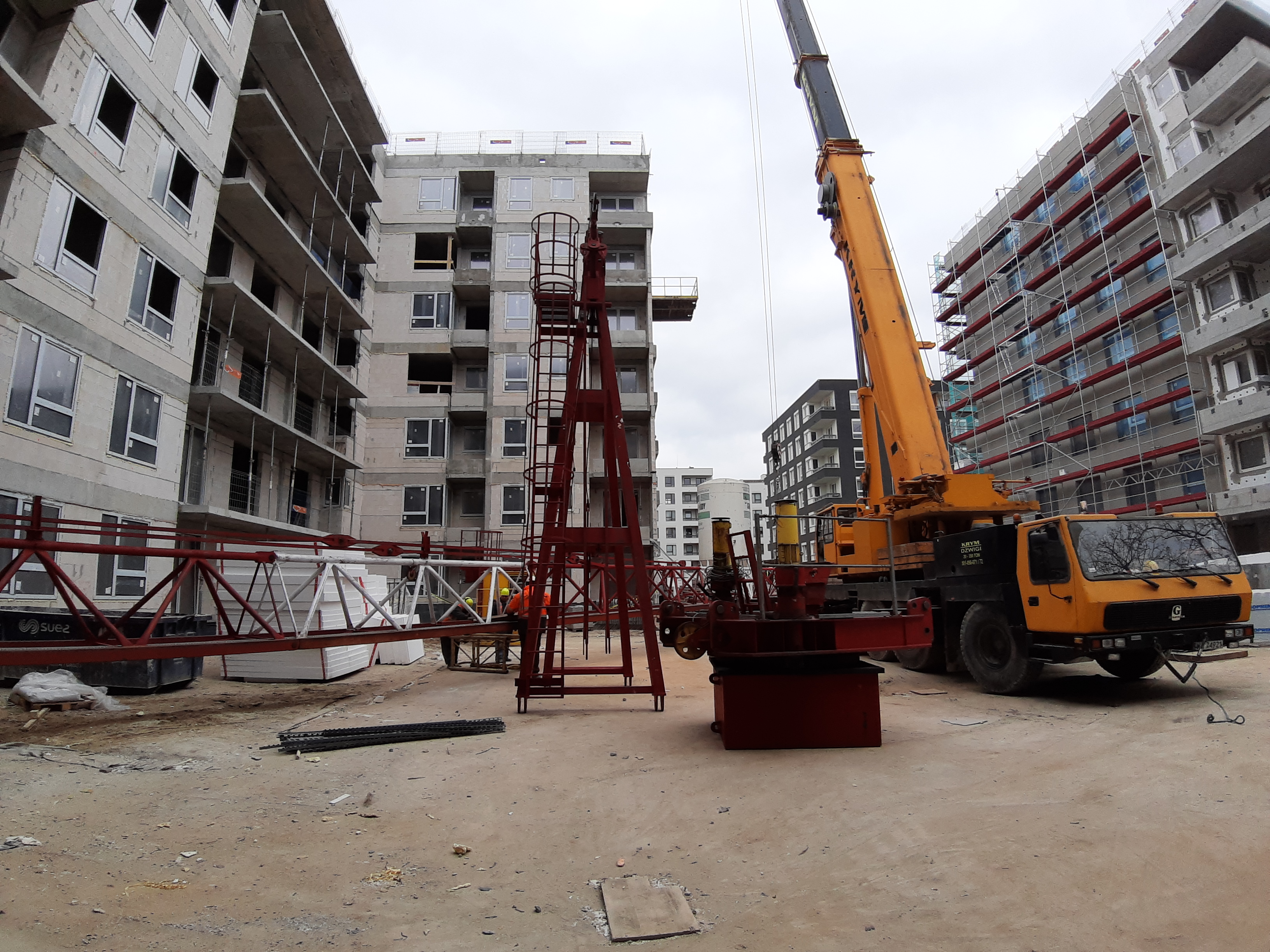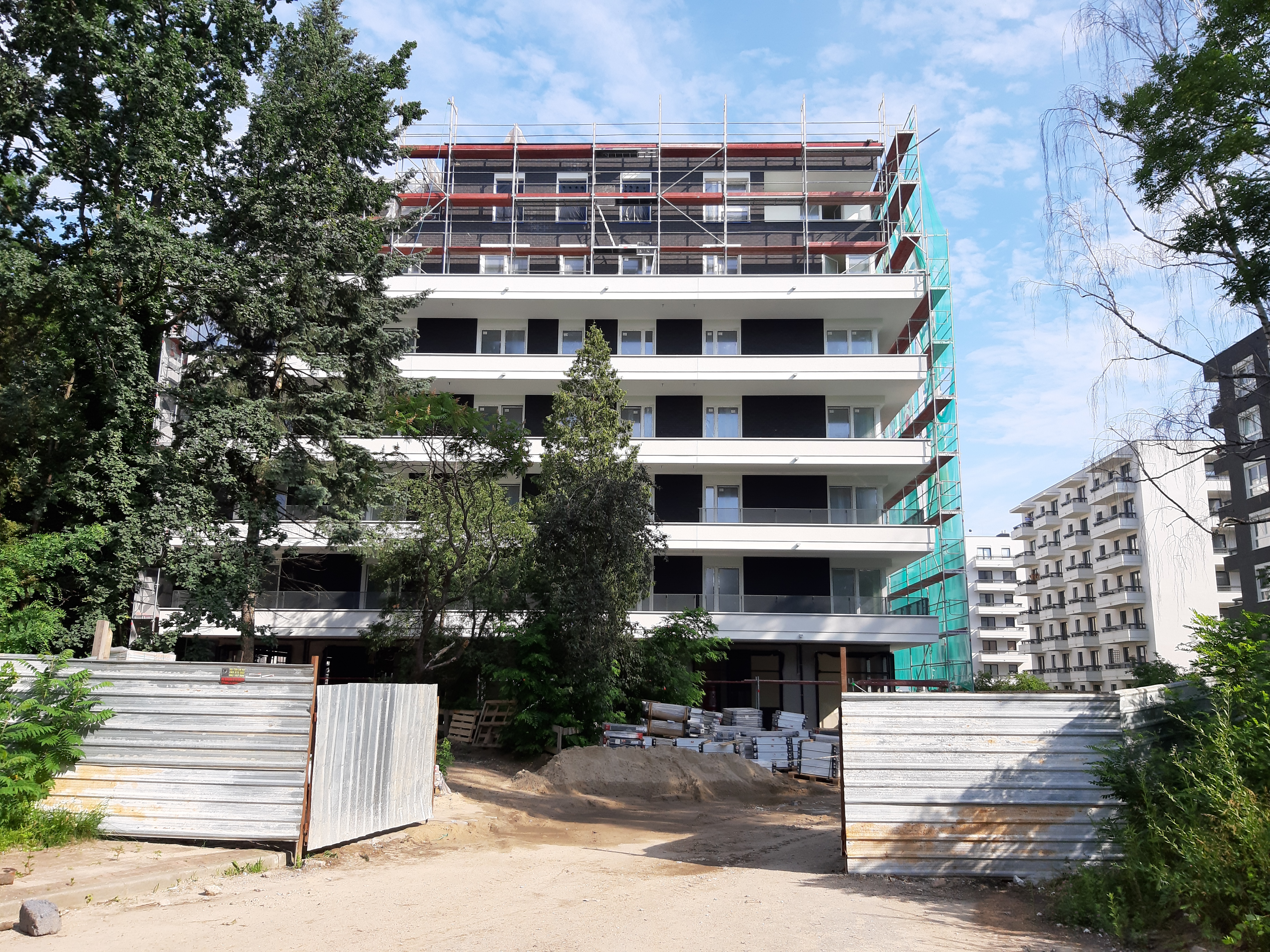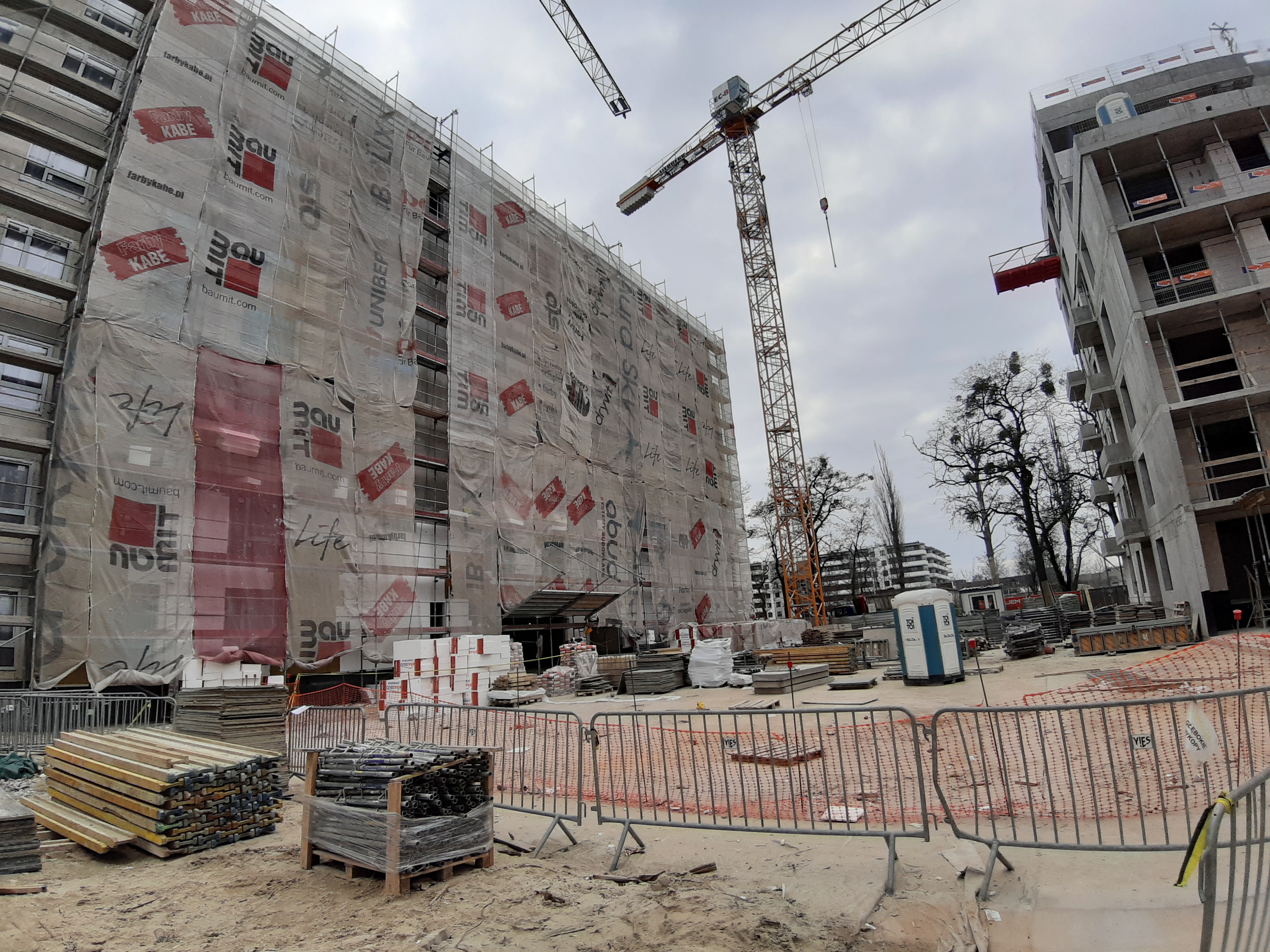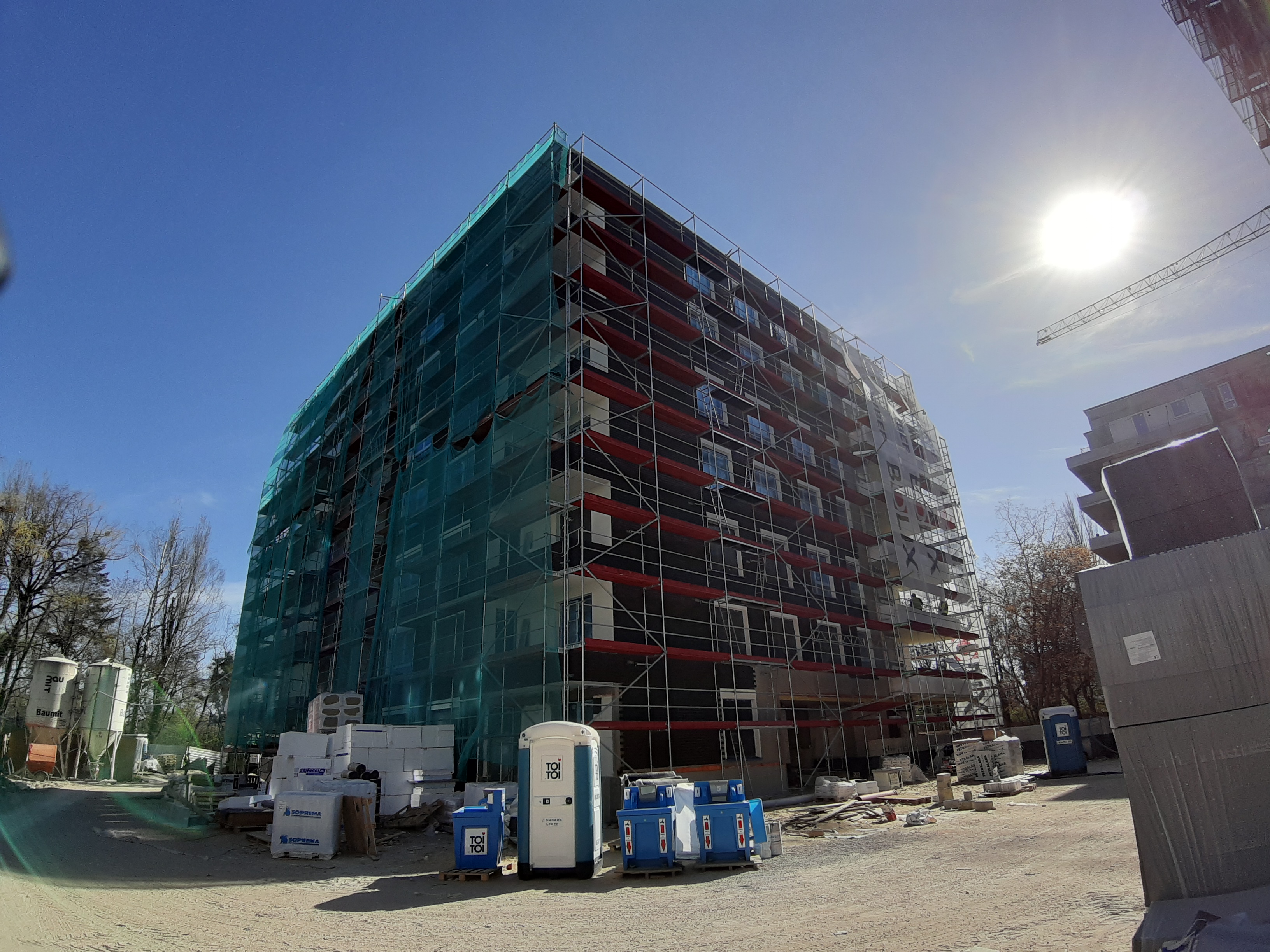 - Część budynku E jest już w rusztowaniach, wykonywane jest również docieplenie budynku.