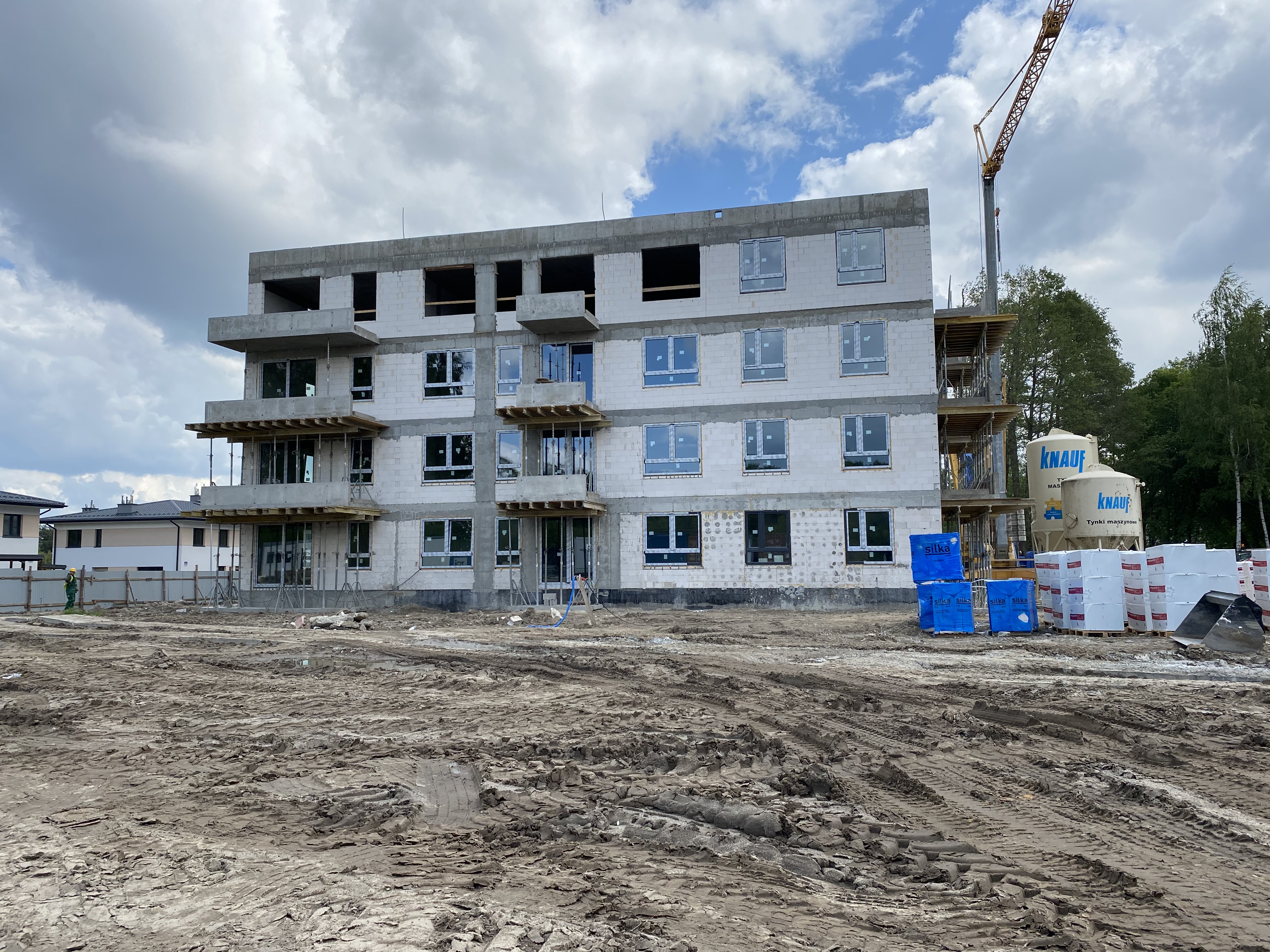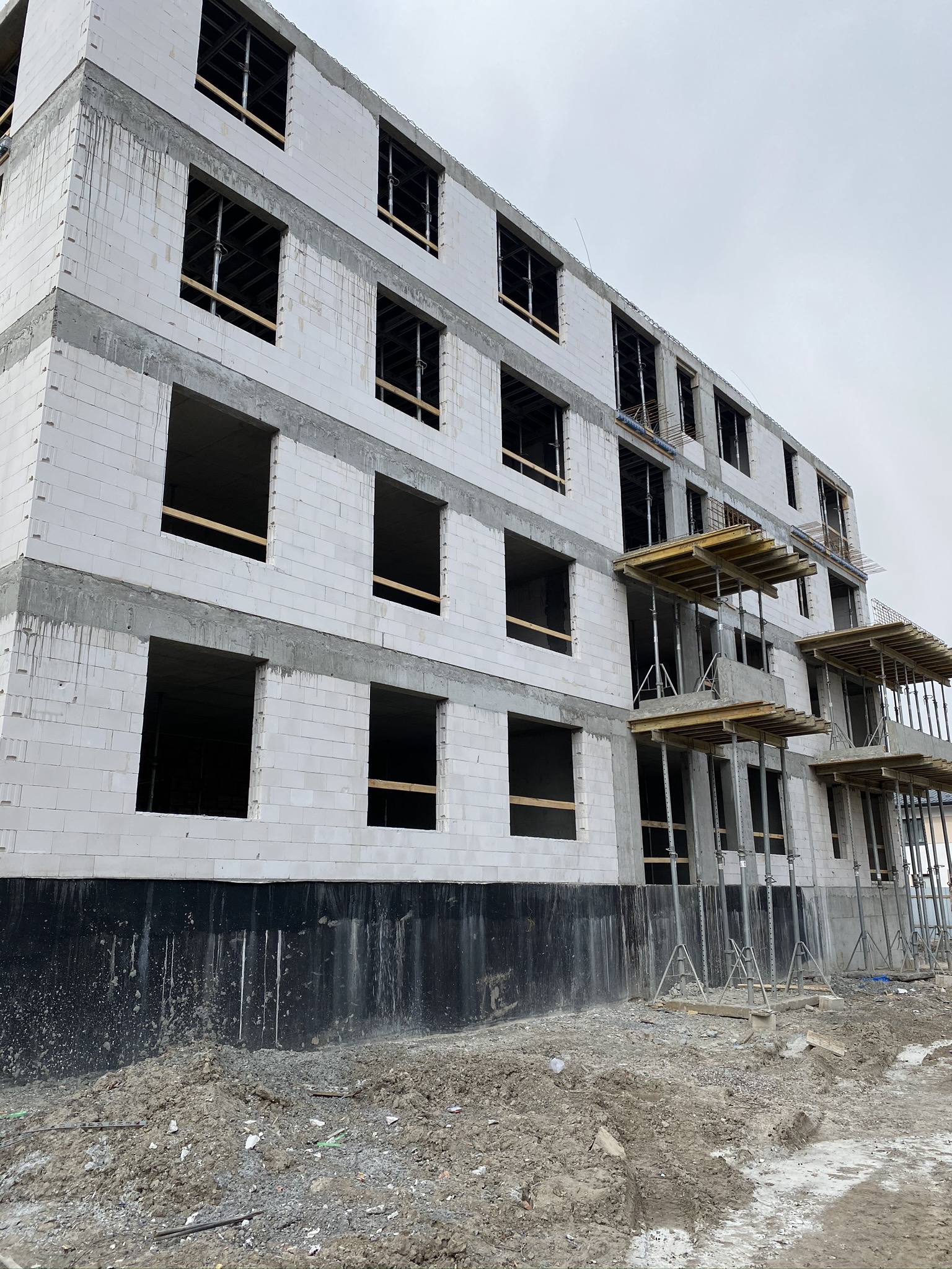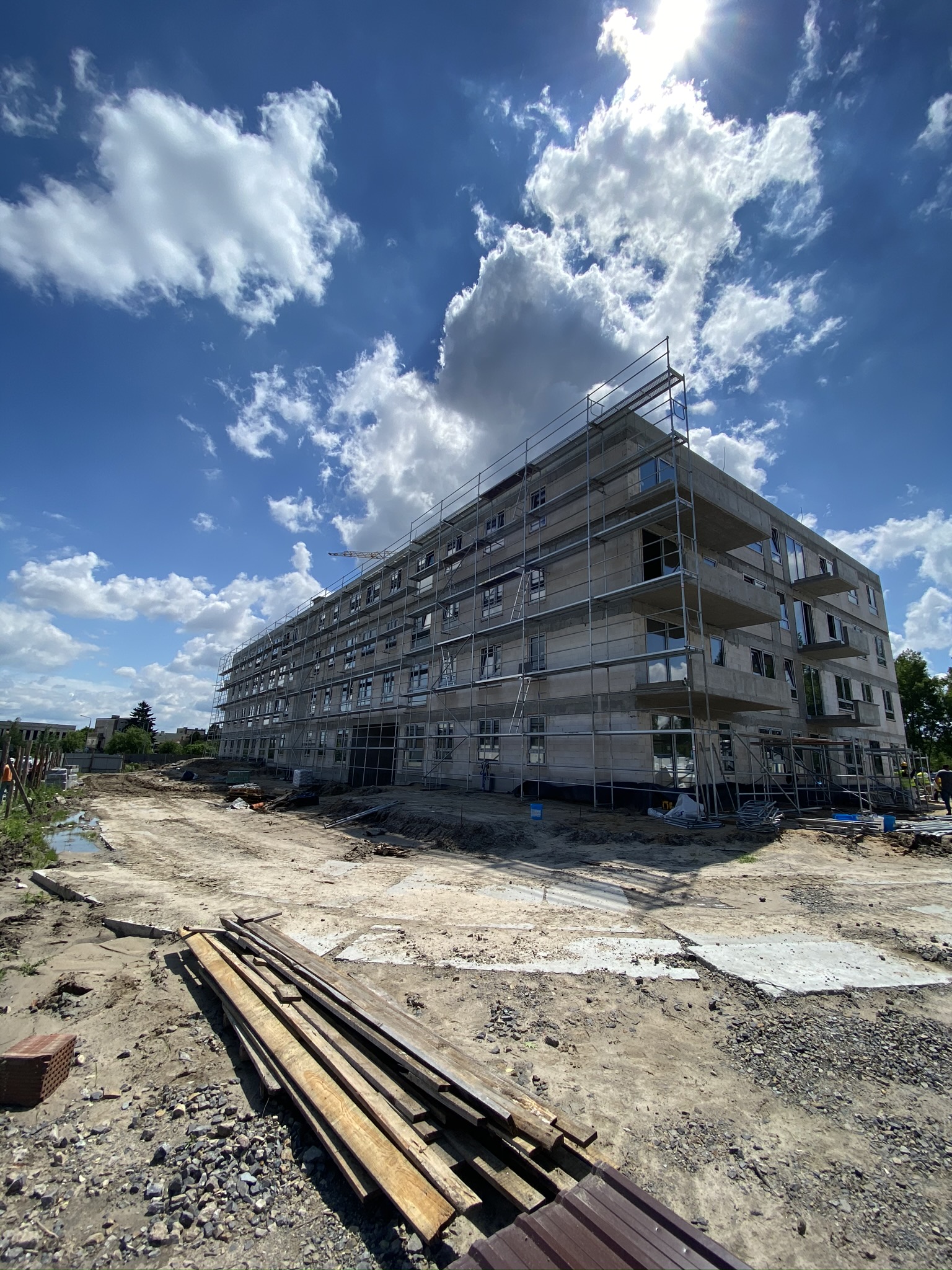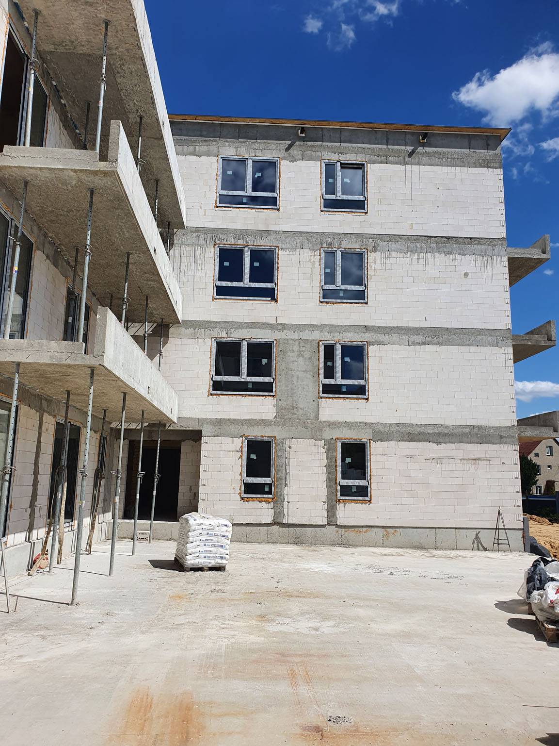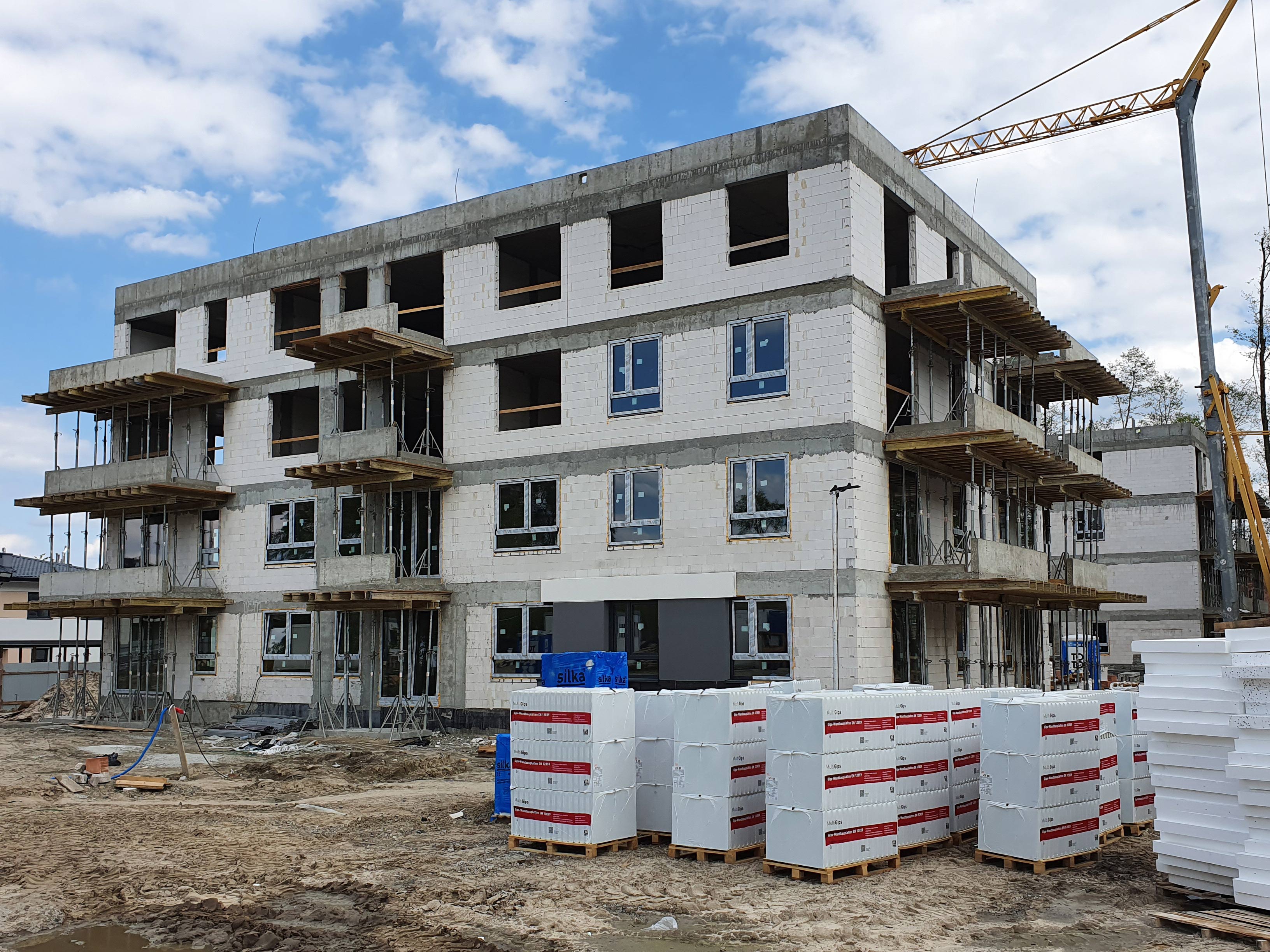 Aktualnie wszystkie prace budowlane postępują zgodnie z założonym harmonogramem. Zbliżamy się do końca prac żelbetowych konstrukcji budynków. Trwają również prace murarskie w zakresie ścian zewnętrznych oraz ścian wewnętrznych.