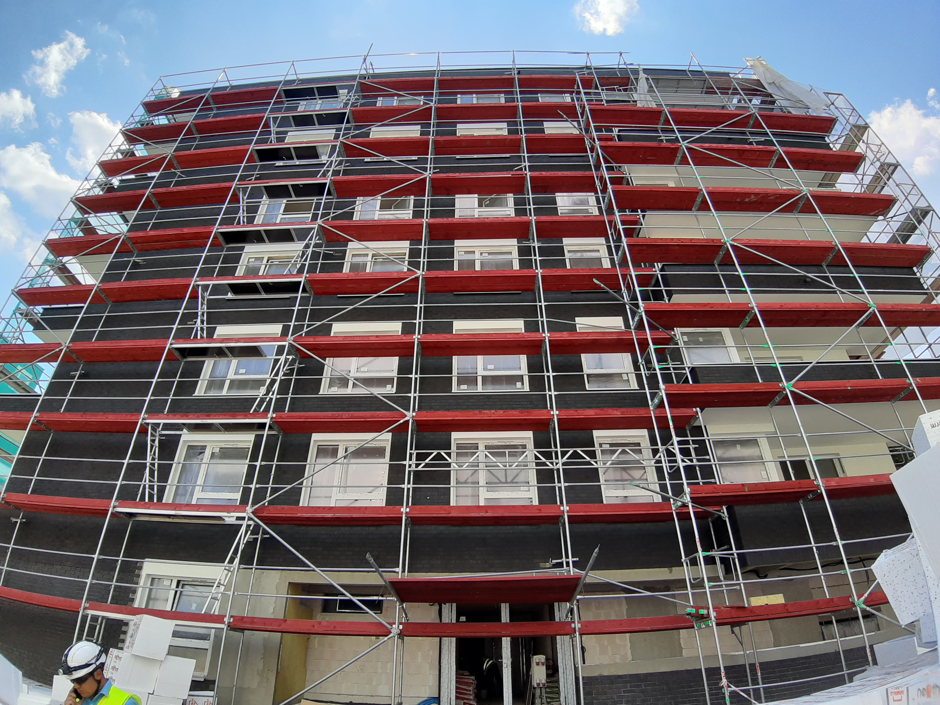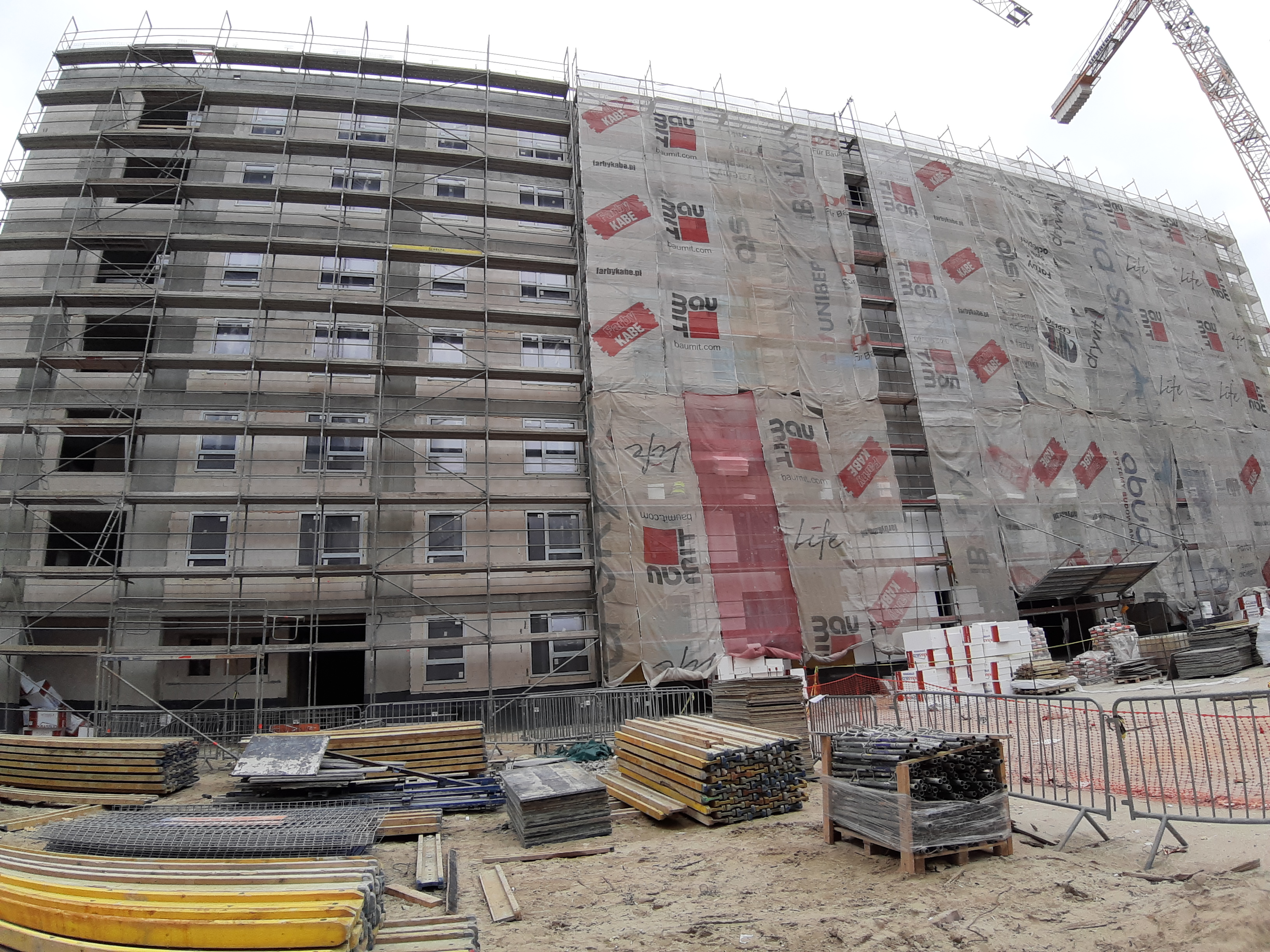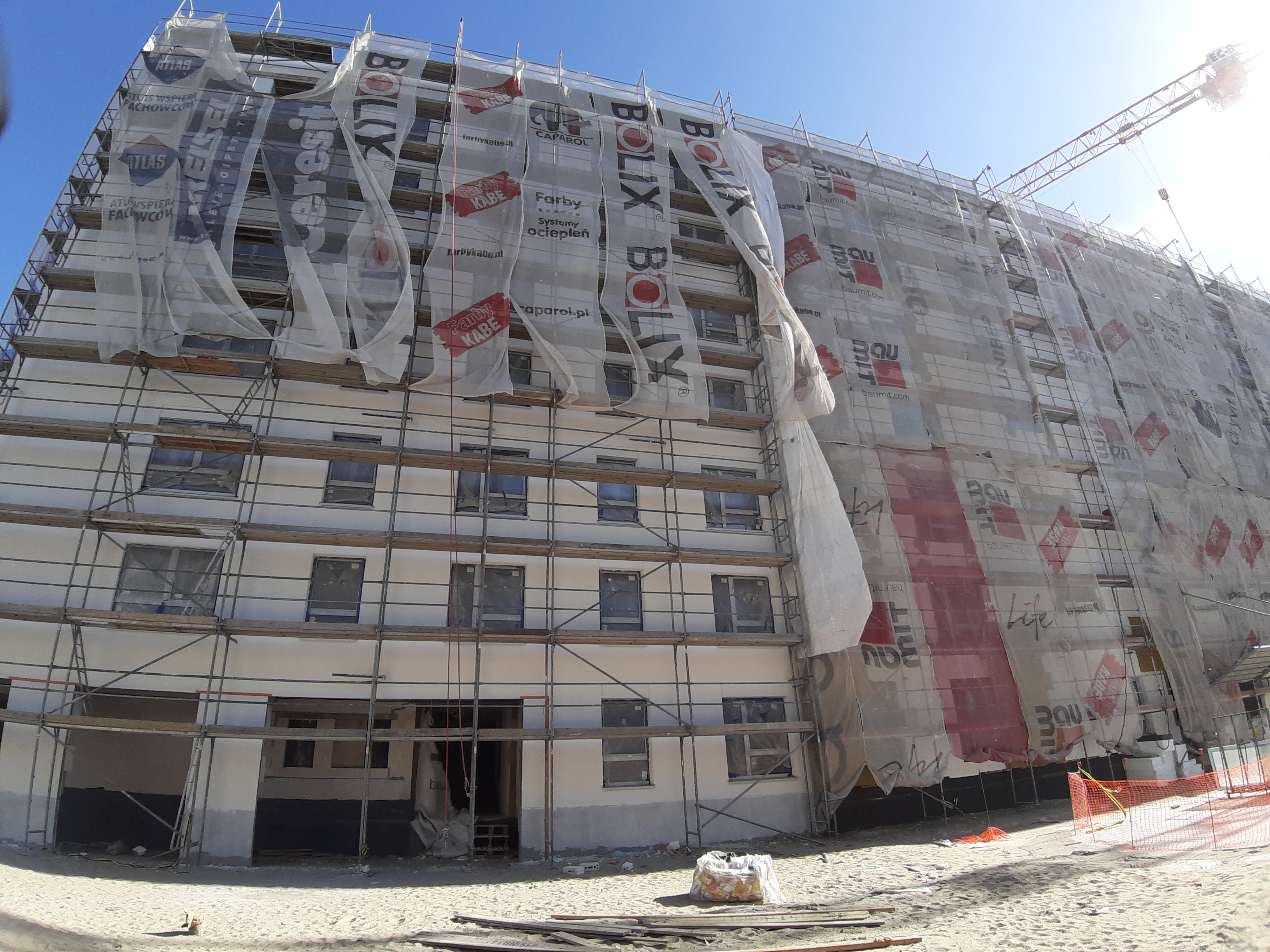 - Część budynku E jest już w rusztowaniach, wykonywane jest również docieplenie budynku.